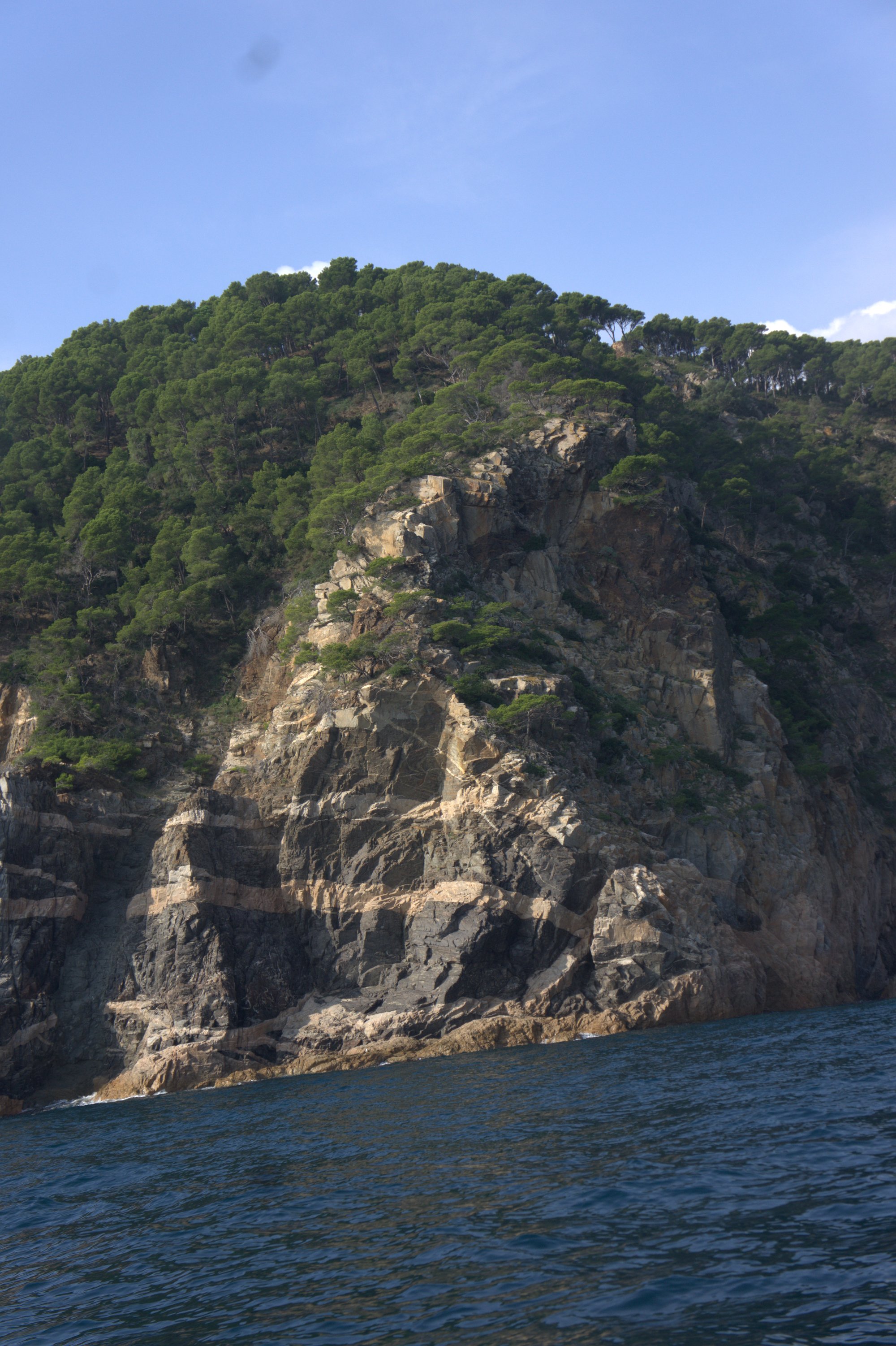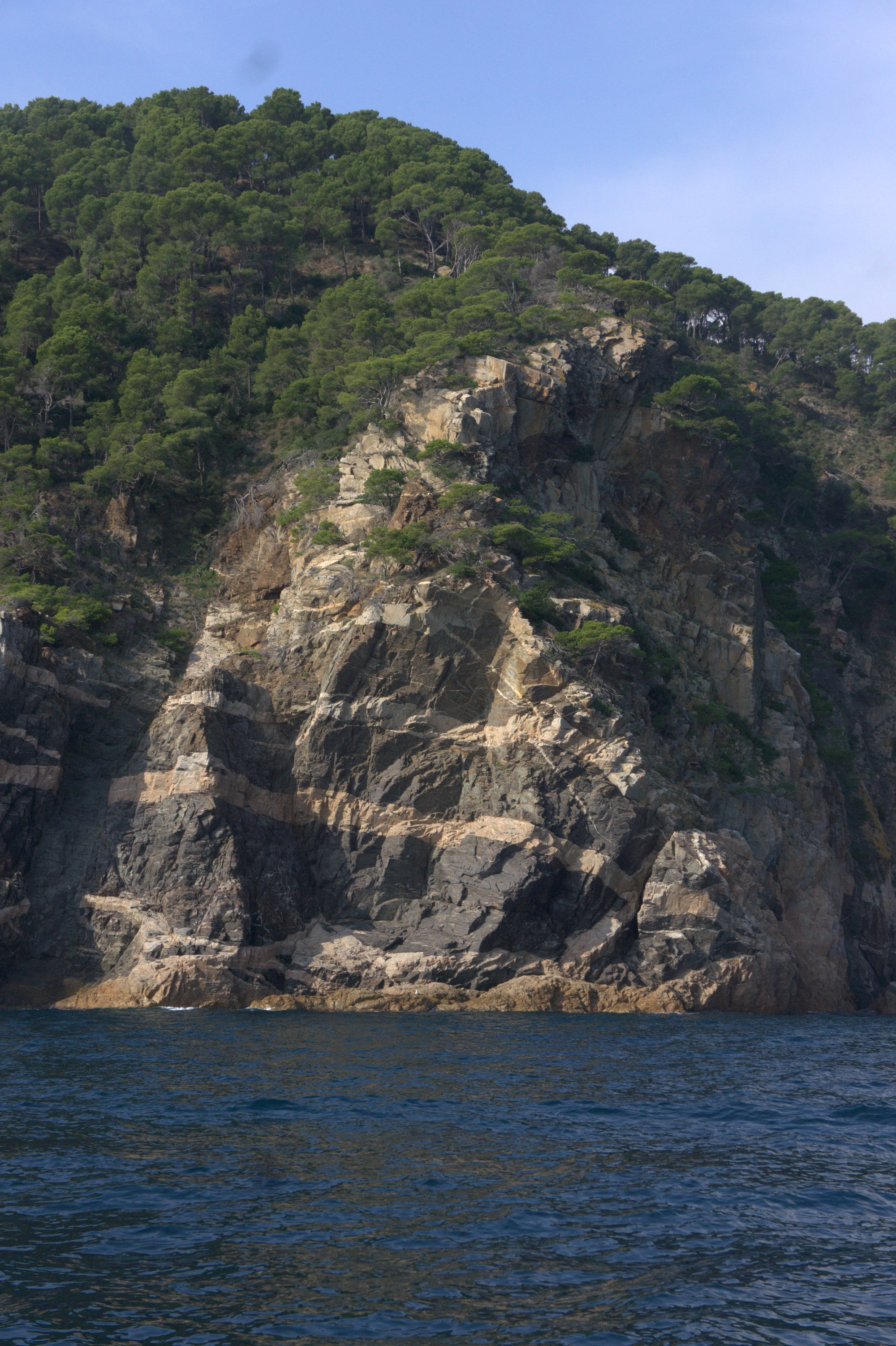 Rocky coastline with submerged pinnacles (Ullastres), promontories (Llosa), parallel canyon systems (Canons de Tamariu), and an offshore archipelago (Illes Formigues). Coastline alternates between rocky capes and small coves.