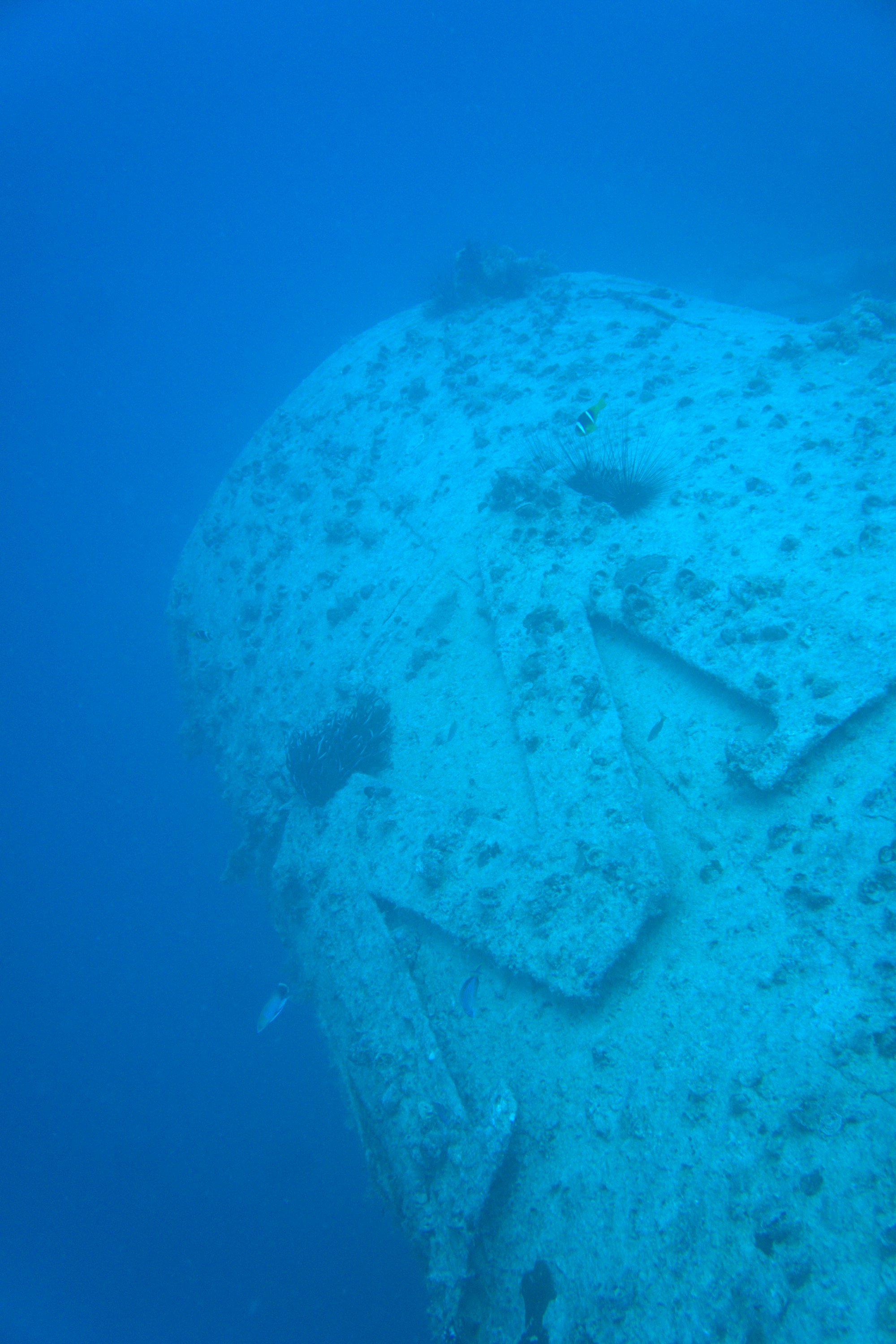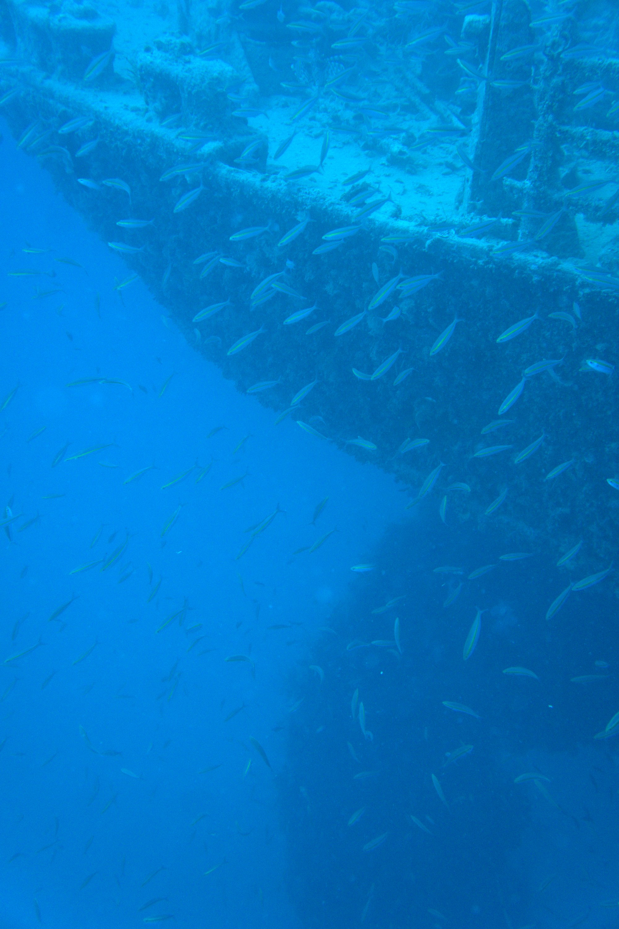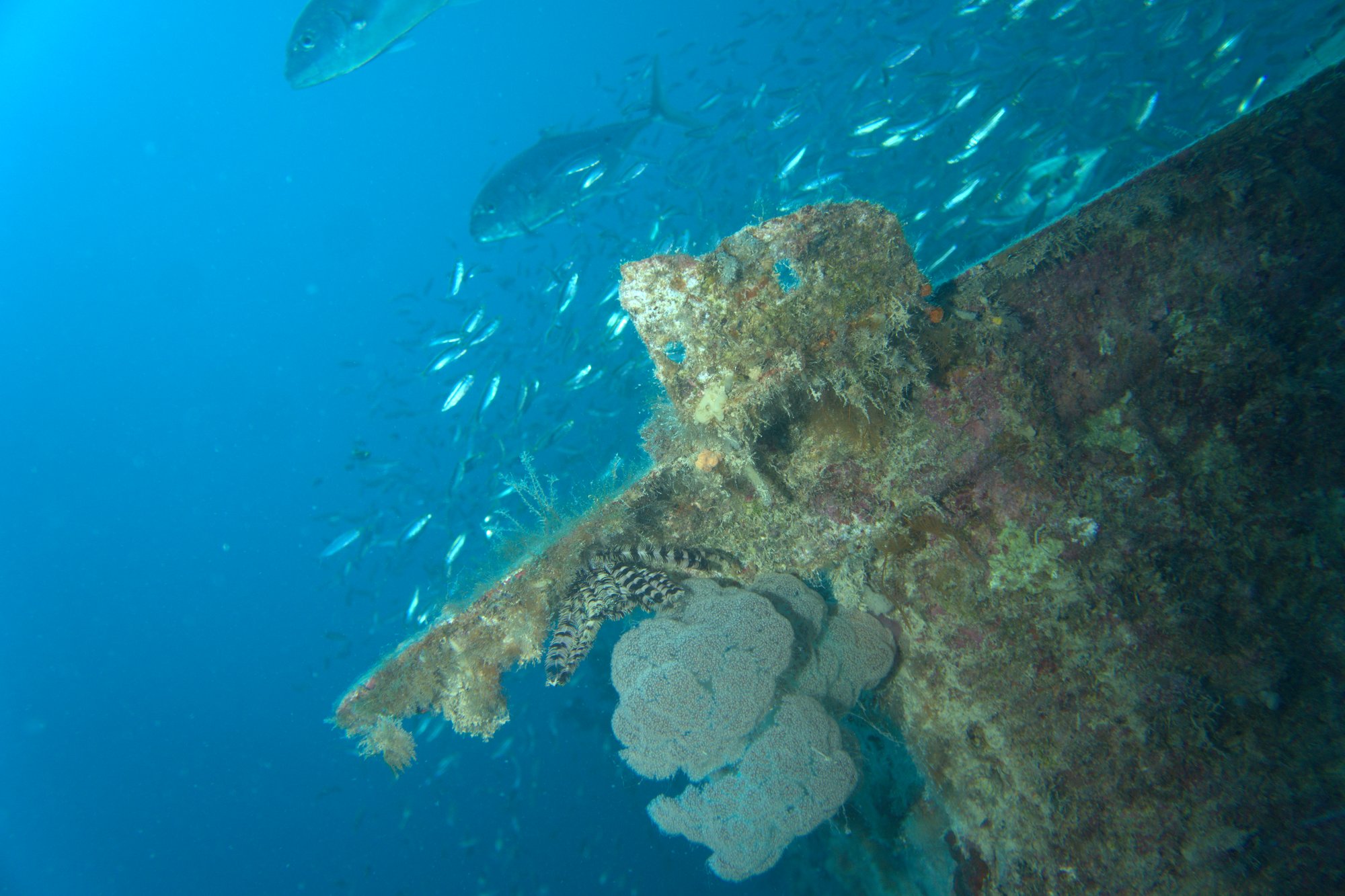 Morning dives bring the best pelagic action — tuna and jacks feeding on the baitfish schools that swirl around the superstructure. Evening dives shift the scene to large groupers emerging from the wreck's interior spaces. Plan for a staged ascent; the forward mast reaches to 17m, providing a structural reference point for safety stops as you work your way back to the surface.