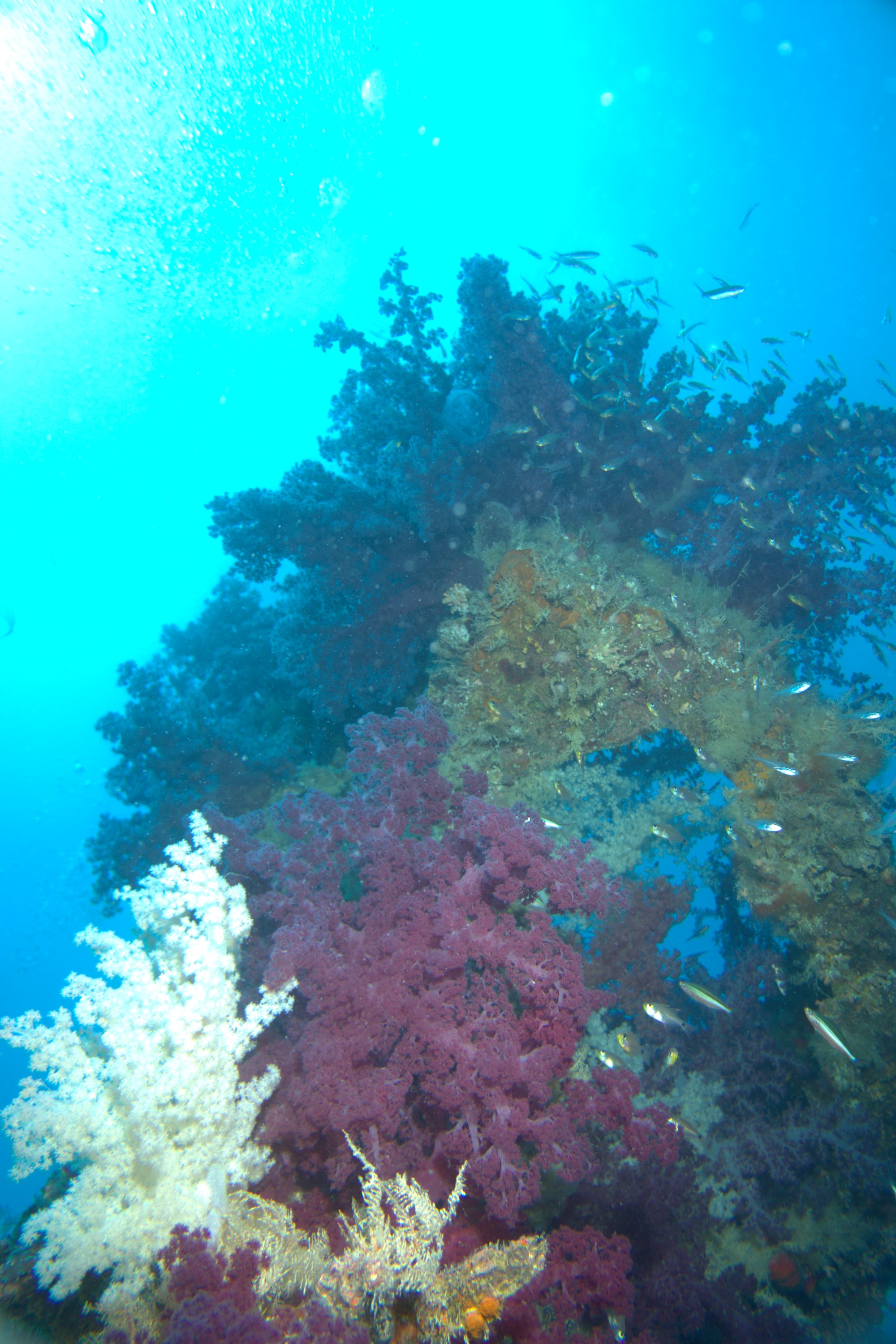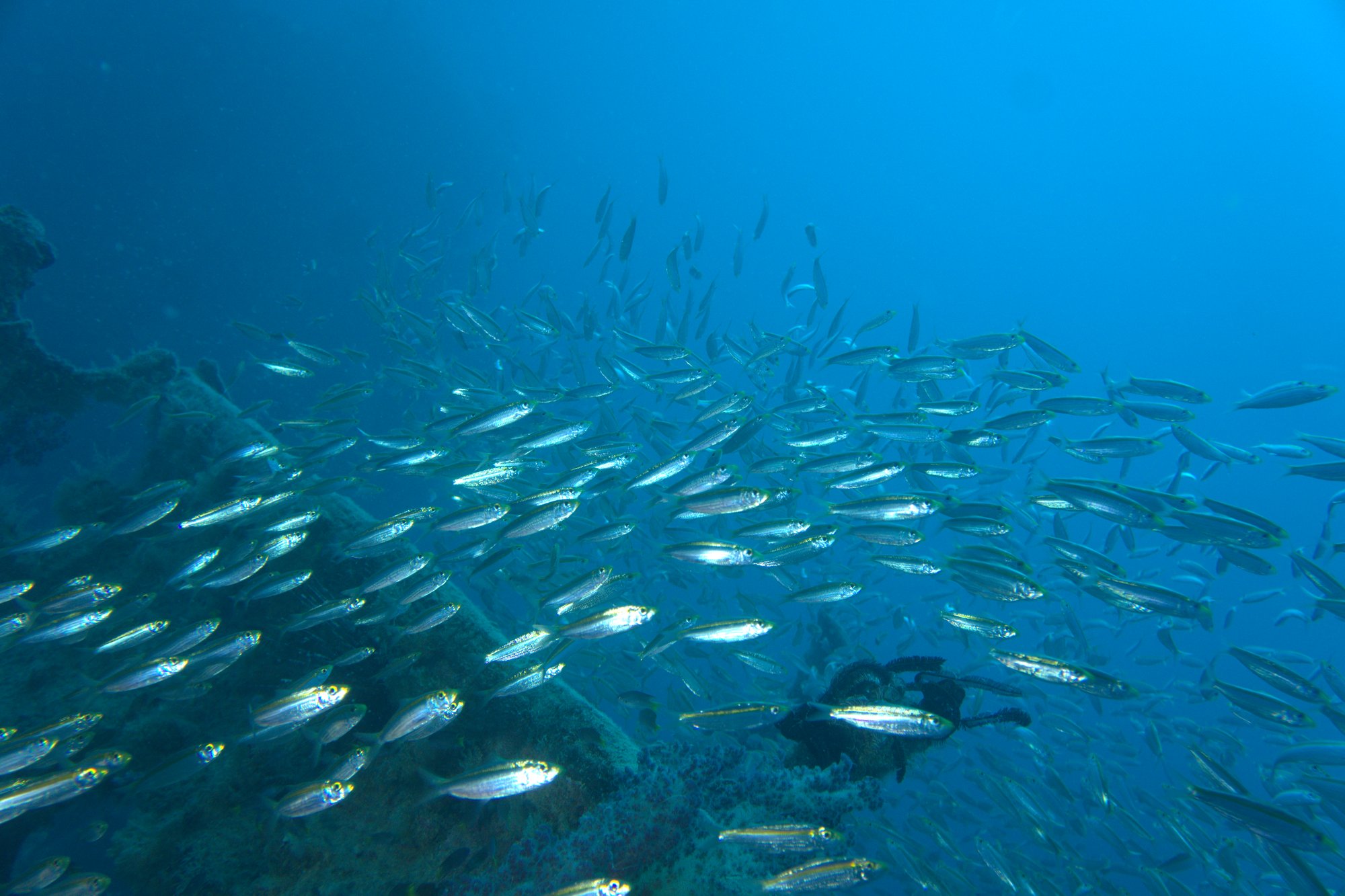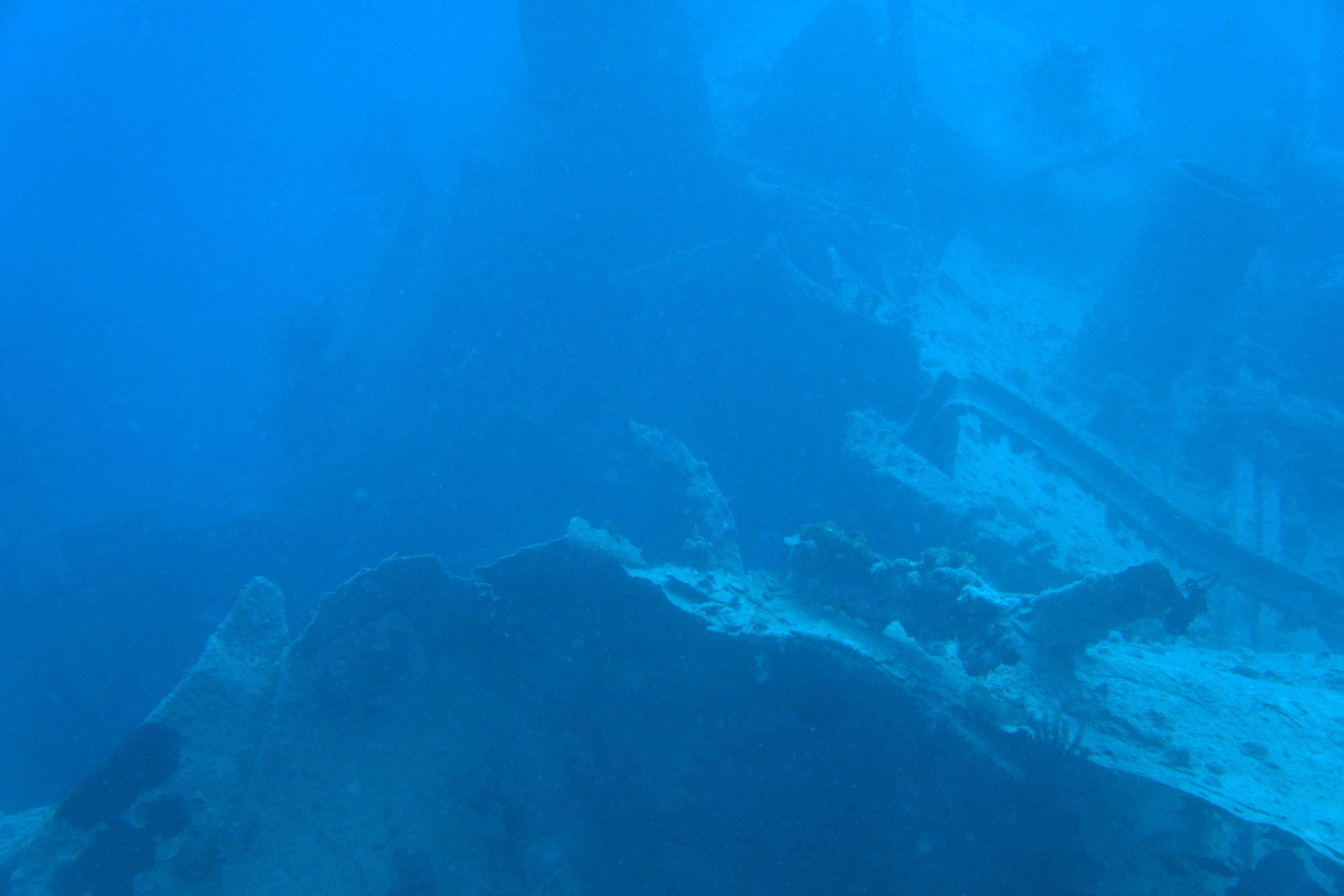 Morning dives bring the best pelagic action — tuna and jacks feeding on the baitfish schools that swirl around the superstructure. Evening dives shift the scene to large groupers emerging from the wreck's interior spaces. Plan for a staged ascent; the forward mast reaches to 17m, providing a structural reference point for safety stops as you work your way back to the surface.