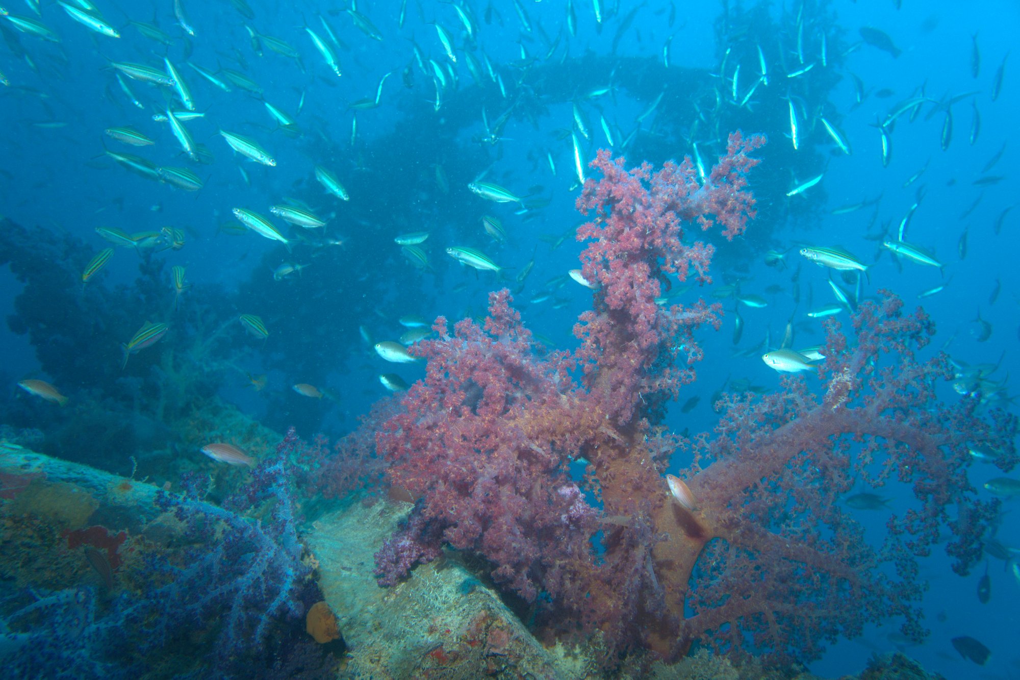 Visibility runs 15-20m on typical days, noticeably lower than the 30m+ that the Red Sea is known for. The Strait of Gubal's currents carry more particulate matter past the wreck than open-water reef sites receive. Inside the wreck, any fin movement raises silt that can reduce visibility to near zero within seconds — a serious consideration at 40m depth. Engine room penetration is possible but demands wreck diving experience, conservative gas planning, and the discipline to turn the dive when conditions deteriorate.