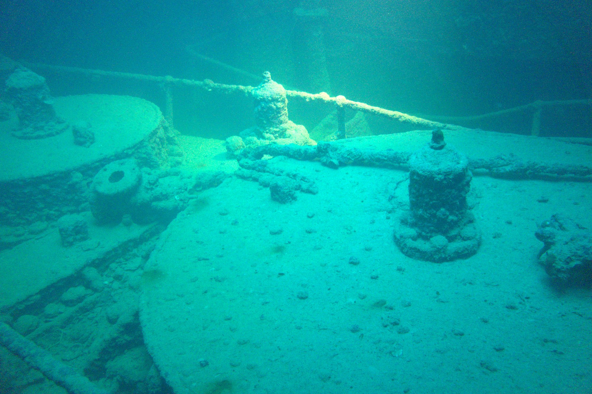Moving aft past the accommodation section, the bridge stands open but stripped bare. The bell, telegraphs, compass, and binnacle were removed by salvagers who found the wreck before it was officially rediscovered. The captain's safe lies forced open on the floor. The funnel, which stood for nearly sixty years, now lies collapsed — toppled in 2001 when someone tied a rope to the copper steam whistle.